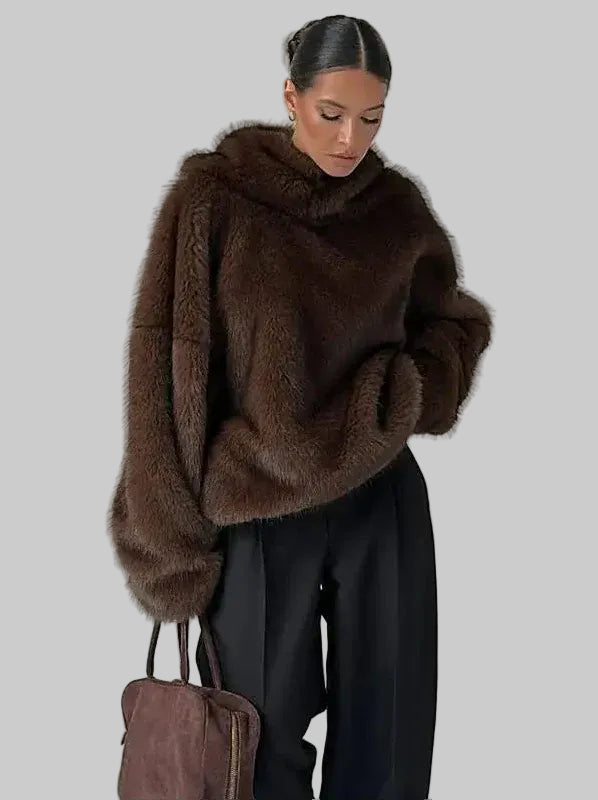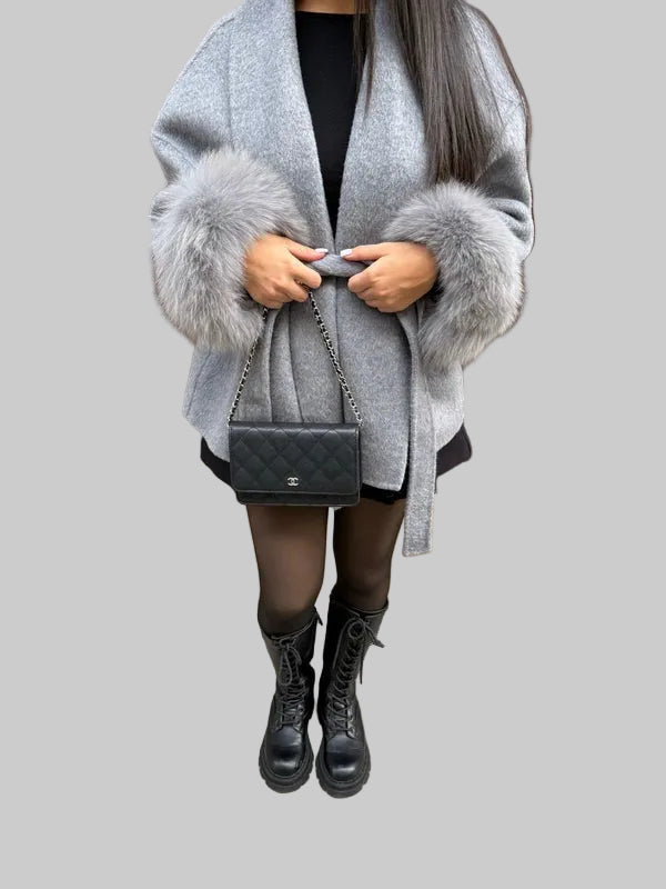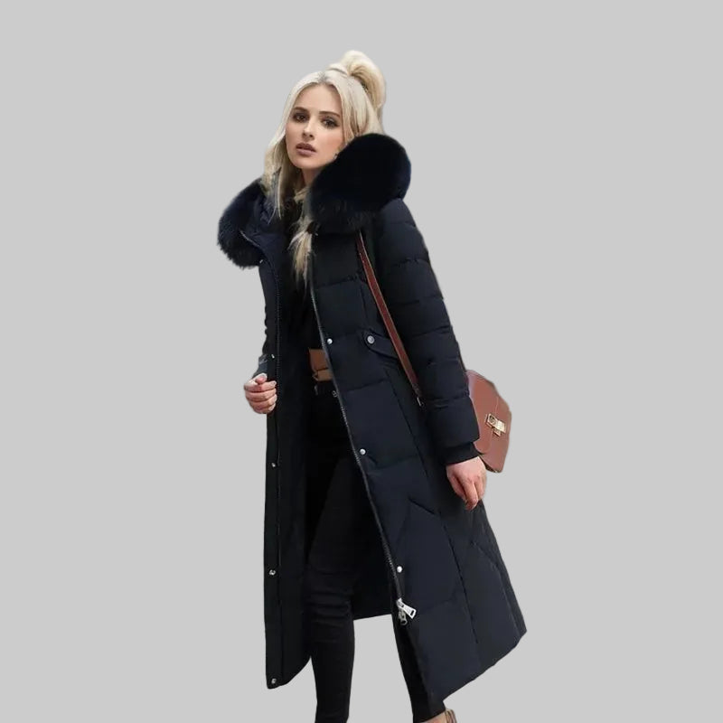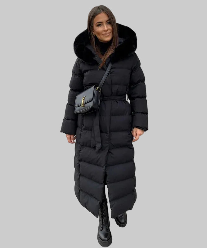 Damski Długi Płaszcz z Kapturem i Futrzanym Wykończeniem