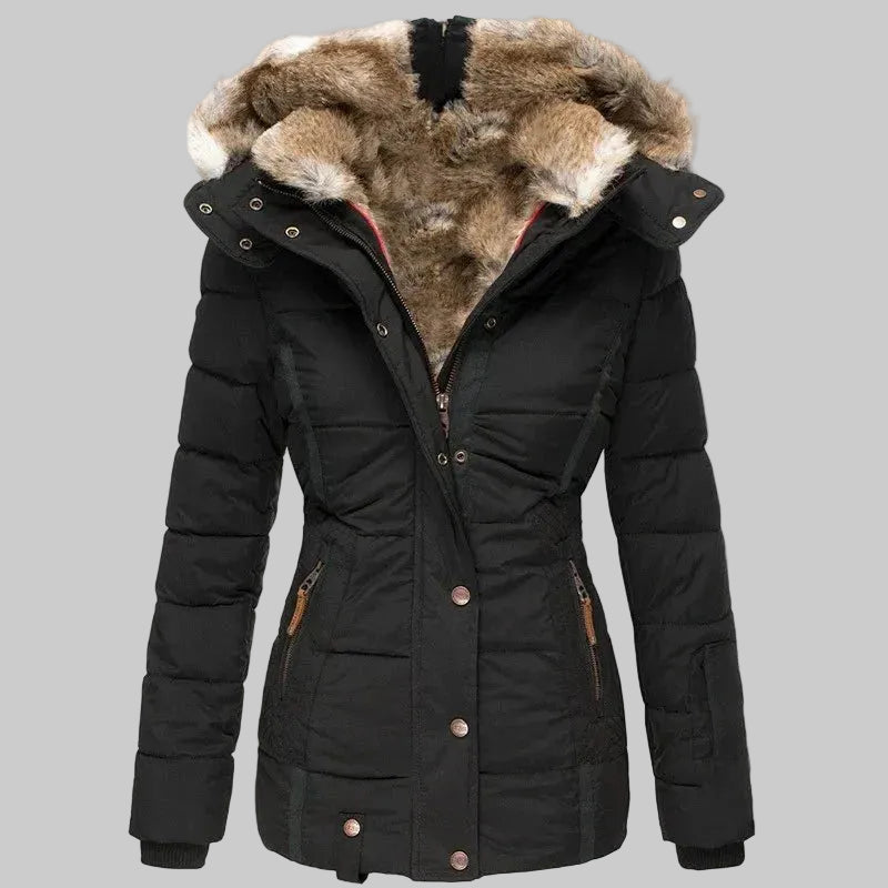 Damska Kurtka Zimowa z Kapturem z Futrzanym Wykończeniem