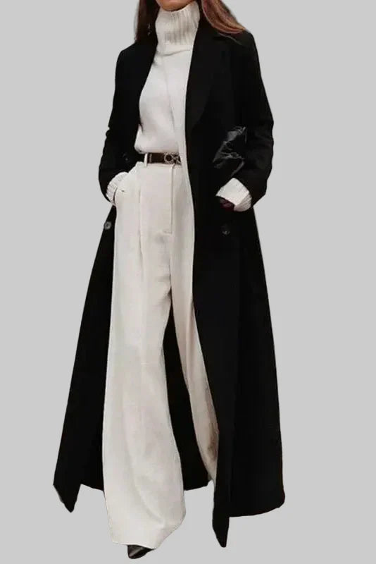 Damski płaszcz długi dwurzędowy z szerokimi klapami