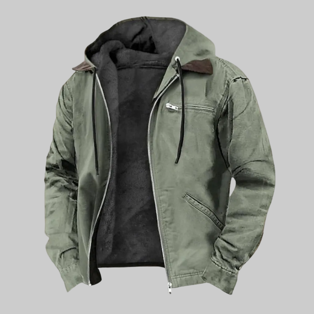 Ta kurtka bomber dla mężczyzn ma zintegrowany kaptur i zapięcie na zamek błyskawiczny z przodu. Kurtka posiada wiele kieszeni na przodzie z klapkami. Rękawy mają ściągacze przy nadgarstkach. Dolny brzeg jest zakończony elastycznym ściągaczem.