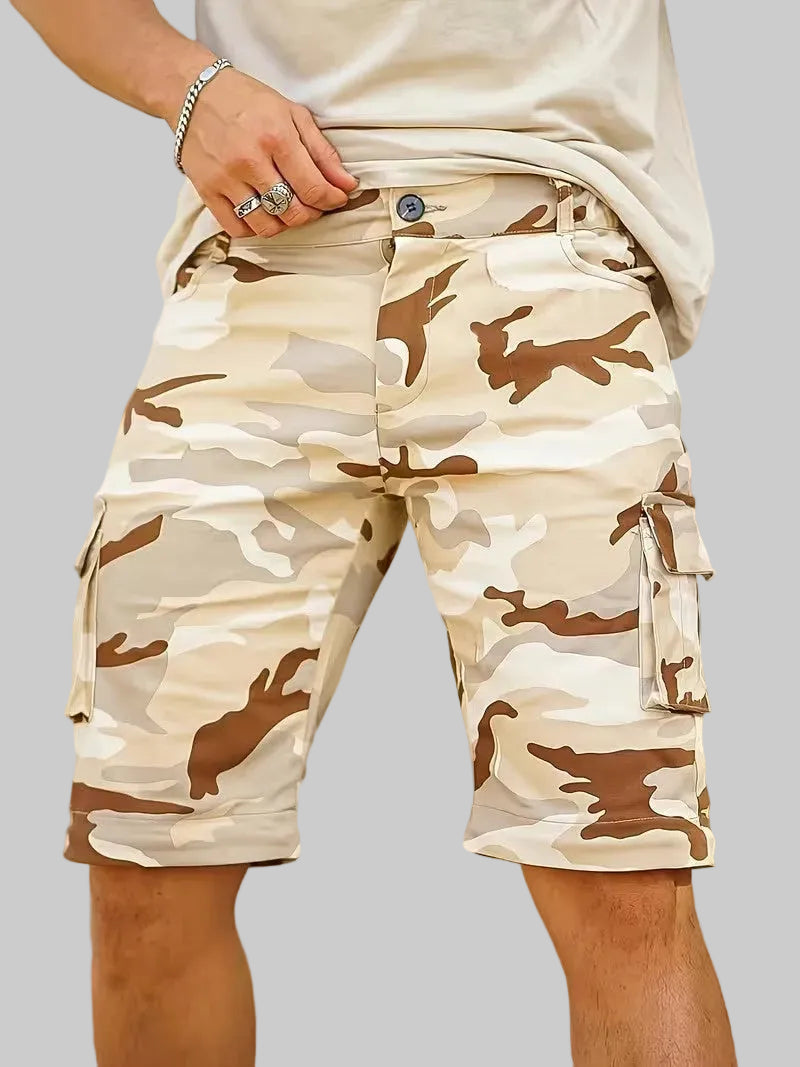 Te męskie szorty mają wzór moro na całej powierzchni. Kieszenie cargo z klapami znajdują się na zewnętrznej części uda każdej nogawki. Po bokach przy biodrach znajdują się kieszenie wsuwane. W pasie znajdują się szlufki na pasek.